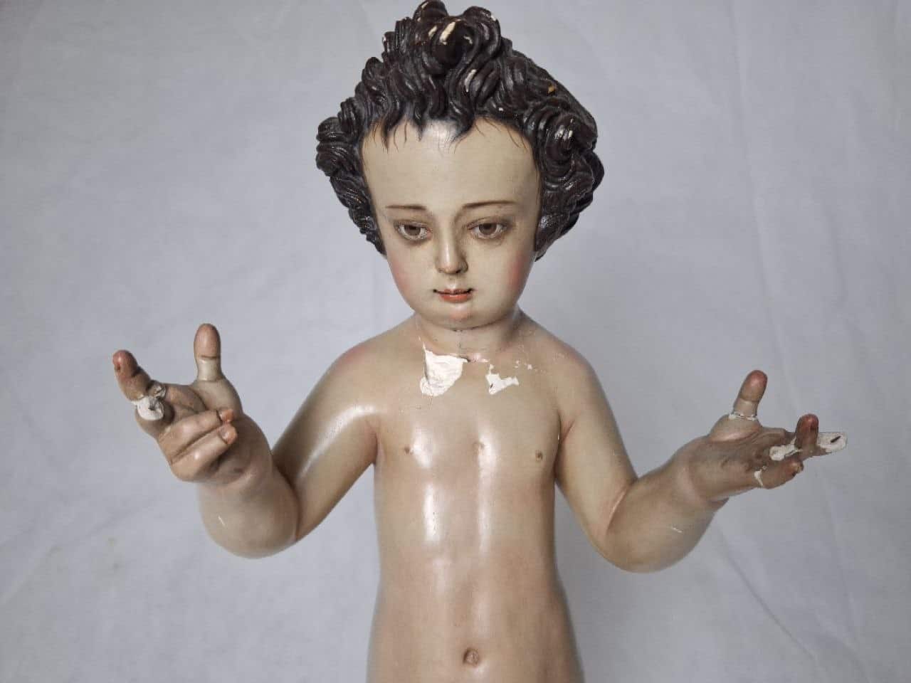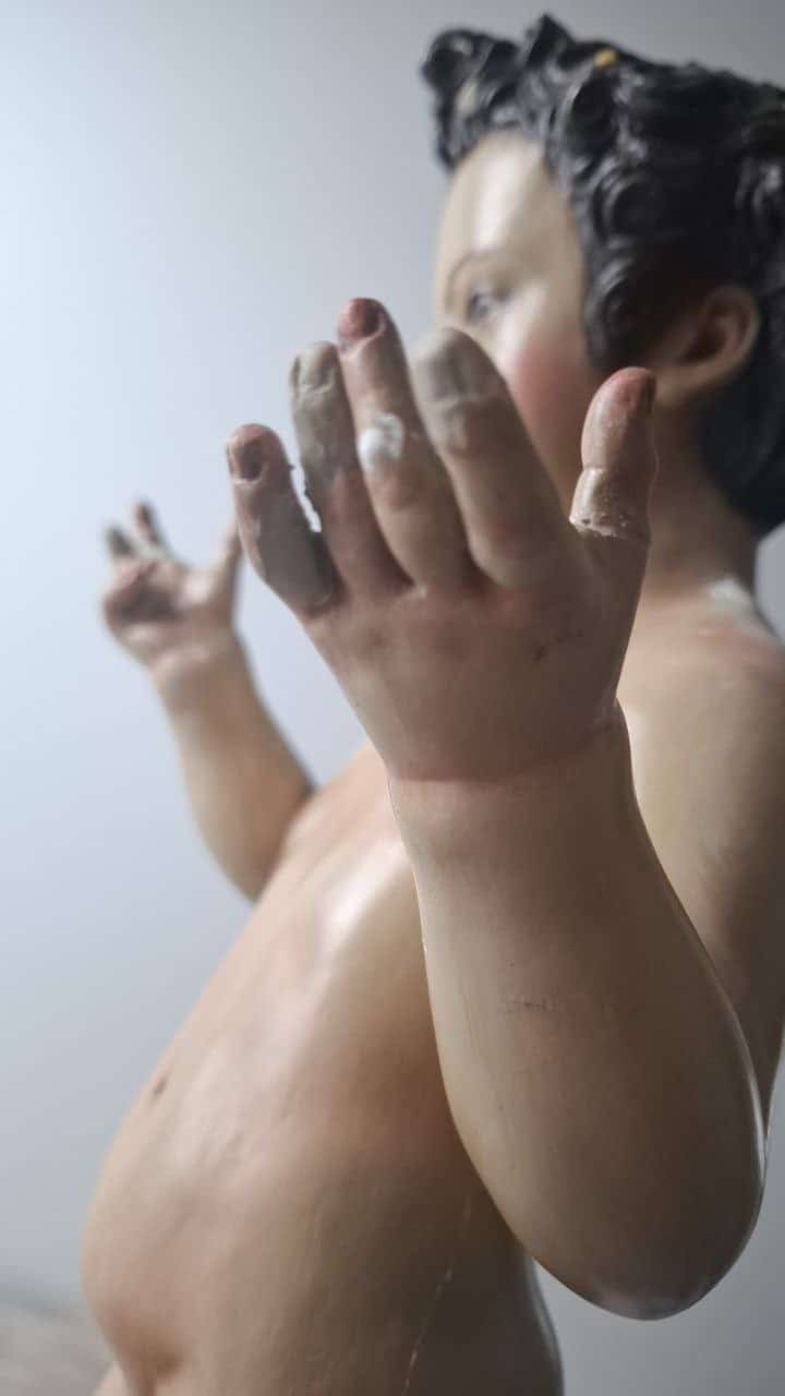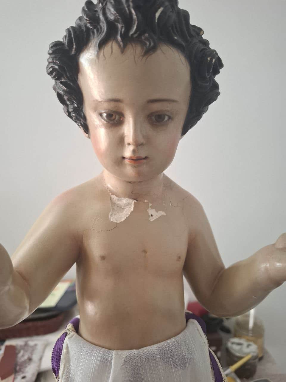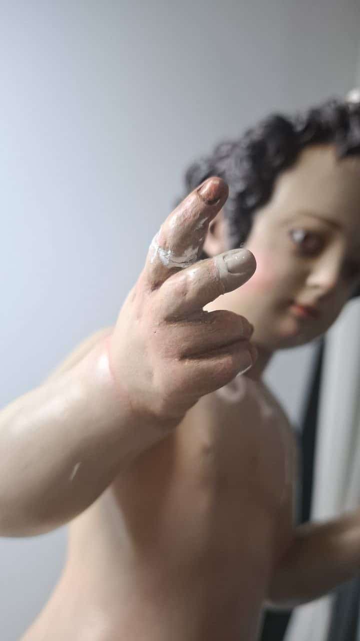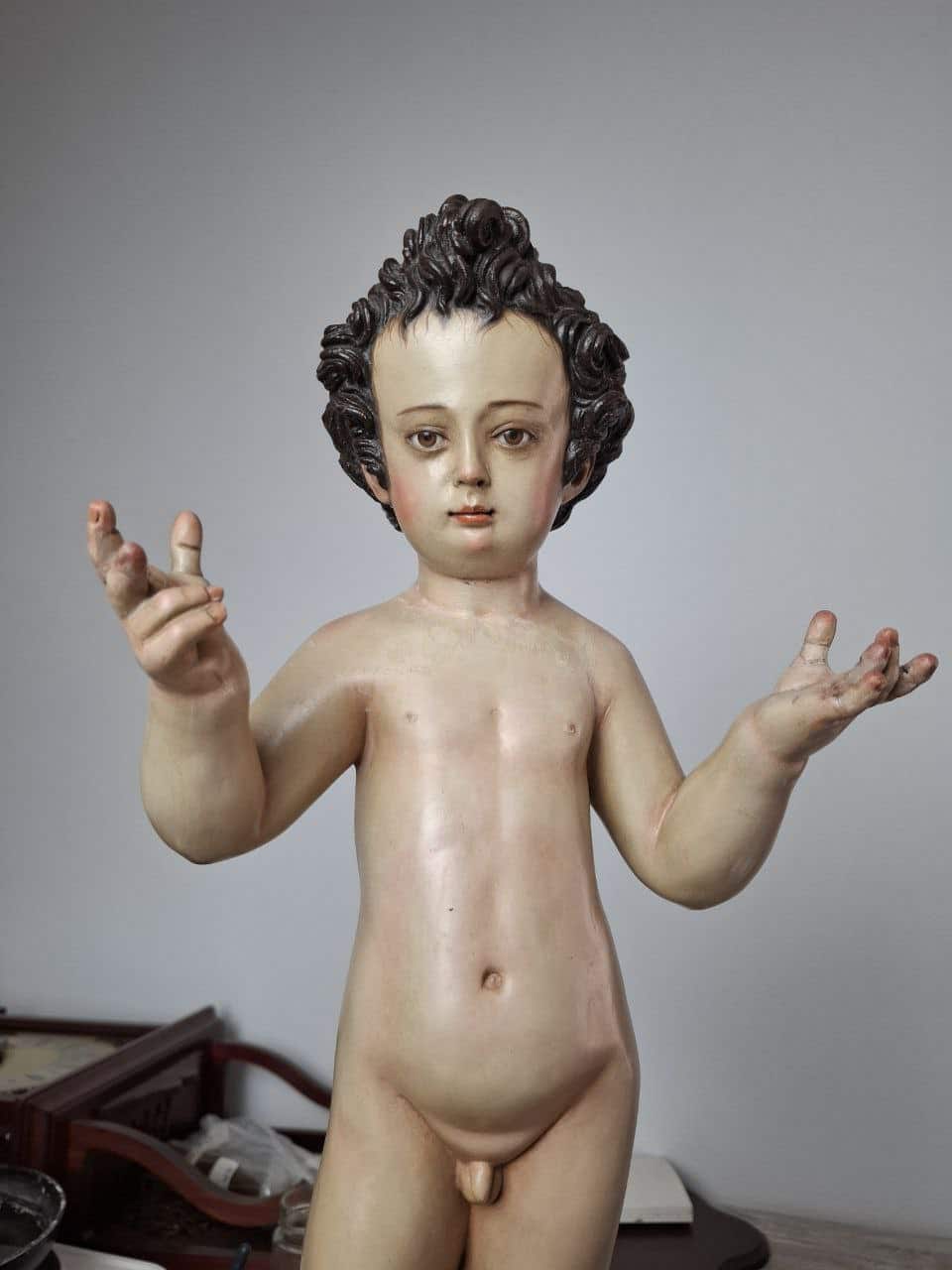 En la intervención se ha limpiado la capa de polícromia y estucado las lagunas, se ha realizado una restauracion volumetrica de los dedos faltantes y la peana, para finalizar con una reintegración cromatica donde se han usado pigmentos al barniz de @leal.productos